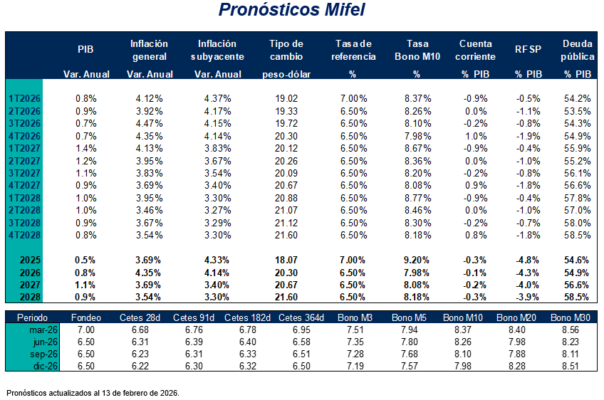 Banca Mifel, ni las demás entidades integrantes de Grupo Financiero Mifel, S.A. de C.V. son responsables por cualquier tipo de pérdida directa o emergente que derive de la utilización de la información del presente documento, pues se reitera que su propósito es meramente informativo. La información y estimaciones que se incluyen en este documento son vigentes a la fecha de su emisión, no obstante, están sujetas a modificaciones sin previo aviso. Banca Mifel no tiene responsabilidad alguna en comunicar los cambios ni a mantener actualizado el documento.