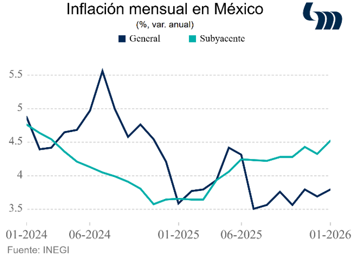 En enero, la inflación repunta a 3.79% anual (vs E Mifel: 3.82%). Pese a que la inflación general se mantiene en el rango de variabilidad (2.0%- 4.0%), el componente subyacente aumenta a 4.50% anual (E Mifel: 4.52%): mercancías 4.56% y servicios 4.48%. En particular, la inflación en mercancías refleja los aumentos por impuestos a bebidas azucaradas y tabaco. Así, la inflación general se mantiene por debajo del 4.0% gracias al todavía buen desempeño del componente no subyacente (1.39% anual). Sin embargo, consideramos que este comportamiento podría revertirse gracias a una base comparativa desfavorable en frutas y verduras.