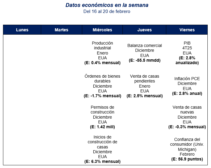 La apuesta de la primer ministro japonesa Sanae Takaichi funciona y consolida su mandato. Su llamada a elecciones resulta en una mayoria abrumadora para su partido, el liberal democráta, en la dieta japonesa, con 316 asientos de los 198 que tenia antes de las elecciones. Esto le da a Takaichi amplio espacio para instrumentar una agenda politica y ecónomica ambiciosa. La reacción inmediata es una apreciacion del yen japonés contra el dólar, que despues de un pico de 157 en Febrero desciende a 152 al cierre de la semana. Falta ver sin embargo si implementa sus planes de una política fiscal muy expansiva. Son movimientos que habrá que seguir con atención, dado el peso que los activos japoneses tienen en el llamado carry trade (esto es, tomar prestado en mercados con tasas bajas y prestar en mercados con tasas altas).