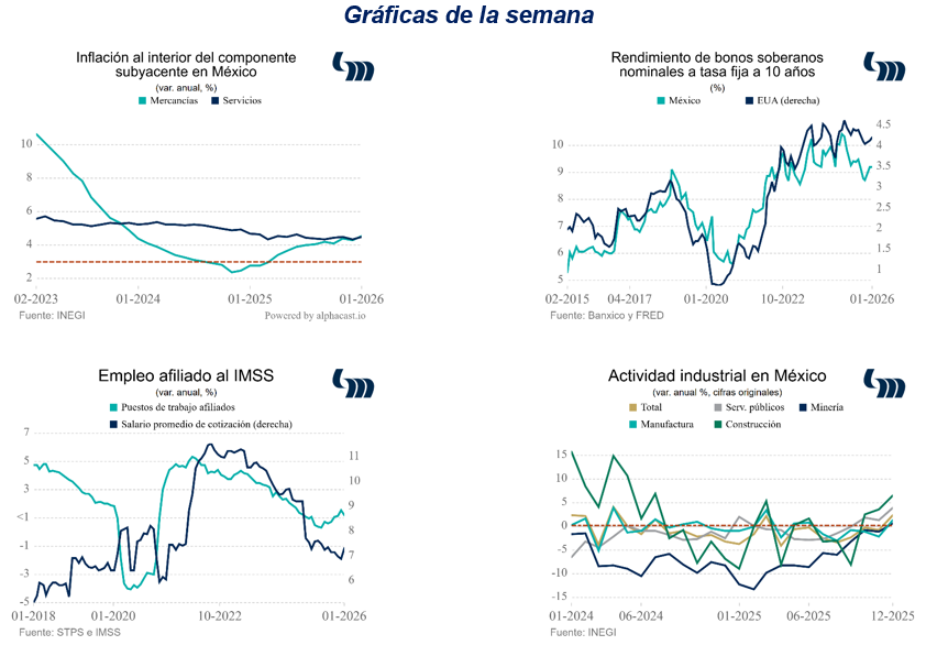 Banxico publica programa monetario de 2026. Los retos más importantes para la conducción de política monetaria este año provienen de la promulgación de los nuevos impuestos y la política arancelaria de EUA, además de un riesgo de desaceleración interna y global, episodios de volatilidad en los mercados financieros y un mayor gasto público. Banxico estima que la brecha del PIB estaría 2%-3% por debajo del componente tendencial hasta al menos diciembre de 2027; proyectan una “tasa de interés” con dos rangos: uno inercial, que desciende a 4%-6% en 2027 y otro denominado contemporáneo (con factores adicionales a la inflación) que baja este mismo año a 3.5%-4.5%. Pero tambien señala que un choque de 100 pb en la inflación subyacente incrementaría la general hasta 4.5% en marzo 2026, para después converger al objetivo inflacionario del 3.0% hacia marzo 2027.