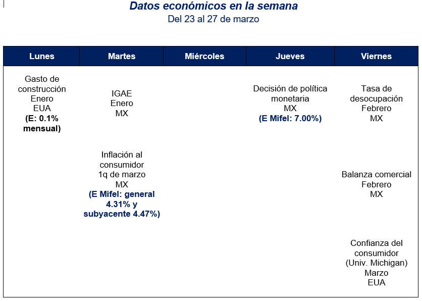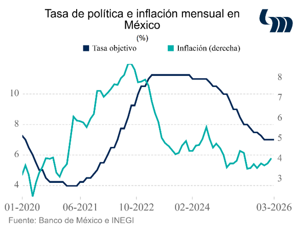 Prevemos que Banco de México mantenga la tasa de referencia en 7.00% en su decisión del próximo 26 de marzo. Ello es consistente con nuestra expectativa original de que sería hasta la reunión de política monetaria del mes de mayo cuando Banxico instrumentaría su primer recorte del 2026. Ahora bien, hay que decirlo; el cambio radical de circunstancias a raíz del conflicto en el Golfo Pérsico fortaleció dicha expectativa, pues además de las inquietudes que preocupan a otros bancos centrales del mundo sobre la materialización de nuevos riesgos inflacionarios, hay algunos factores más que la junta de gobierno de Banxico deberá tomar en cuenta. Primero, la trayectoria de inflación a la fecha ha dejado que desear (ver siguiente apartado). Segundo, aunque los impactos sobre los precios de la gasolina podrían ser amortiguados por ajustes en el IEPS – algo que la presidenta Sheinbaum reiteró durante su participación en la convención bancaria – los efectos sobre los precios de fertilizantes y eventualmente agropecuarios no deben soslayarse; esto también lo destacó la mandataria. Finalmente, aunque la reaccion del tipo de cambio ante riesgos geopolíticos ha sido ordenada y acotada, no deja de ser un factor a vigilar desde el punto de vista inflacionario. Todo ello sugiere que, como ocurre con otros bancos centrales en el mundo, la mejor política es esperar antes de disparar.