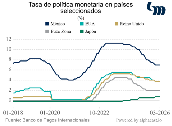 Decisiones de política monetaria de otros bancos centrales: todos en compás de espera. El Banco Central Europeo, el Banco de Inglaterra y el Banco de Japón mantienen sus tasas de referencia en 2.00%, 3.75% y 0.75%, respectivamente. Los tres coinciden en que el conflicto en Medio Oriente generará presiones al alza sobre la inflación y reconocen la incertidumbre sobre la magnitud de los efectos de la guerra. En cuanto a sus perspectivas particulares, el BCE revisa al alza su previsión de inflación para 2026 a 2.6% anual (vs. 1.9% anterior) y el Banco de Inglaterra advierte que la inflación podría alcanzar 3.5% en los próximos trimestres—lejos del 2.0% que se anticipaba a partir de abril. El Banco de Japón, por su parte, subraya que es probable que hacia adelante continúe con las subidas de sus tipos de interés.