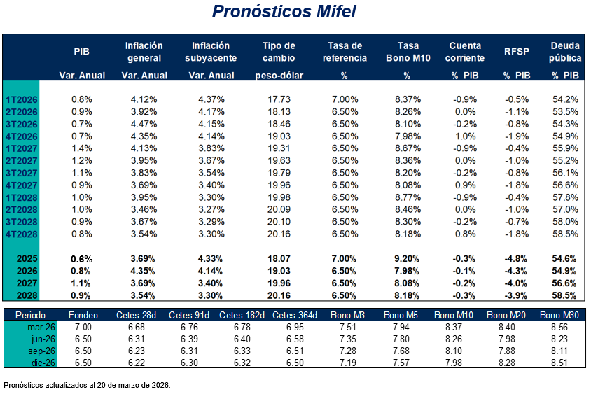 Banca Mifel, ni las demás entidades integrantes de Grupo Financiero Mifel, S.A. de C.V. son responsables por cualquier tipo de pérdida directa o emergente que derive de la utilización de la información del presente documento, pues se reitera que su propósito es meramente informativo. La información y estimaciones que se incluyen en este documento son vigentes a la fecha de su emisión, no obstante, están sujetas a modificaciones sin previo aviso. Banca Mifel no tiene responsabilidad alguna en comunicar los cambios ni a mantener actualizado el documento.