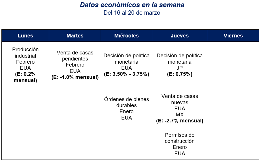 La inflación en EUA se mantiene en 2.4% anual en febrero y su componente core en 2.5%. Mientras los alimentos suben 3.1%, los energéticos inciden a la baja, con 0.5%. Los precios de la gasolina y el gas reportan variaciones anuales de -5.6% y 10.9%, respectivamente – todavía no capturan el conflicto en el Golfo Pérsico. Así, en marzo deben observarse mayores presiones por estos dos componentes. En consecuencia, el mercado descuenta con una probabilidad del 99.4% que la Fed no realizará un recorte de tasa en su reunión del 18 de marzo; como ocurre cada trimestre, la reunión incluye actualización de proyecciones económicas y conferencia de prensa. Ya los banqueros centrales en los EUA han indicado en distintos foros que deberán ser muy “dependientes de los datos”.