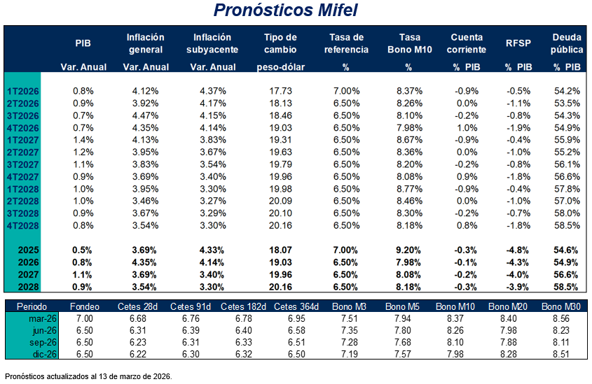 Banca Mifel, ni las demás entidades integrantes de Grupo Financiero Mifel, S.A. de C.V. son responsables por cualquier tipo de pérdida directa o emergente que derive de la utilización de la información del presente documento, pues se reitera que su propósito es meramente informativo. La información y estimaciones que se incluyen en este documento son vigentes a la fecha de su emisión, no obstante, están sujetas a modificaciones sin previo aviso. Banca Mifel no tiene responsabilidad alguna en comunicar los cambios ni a mantener actualizado el documento.