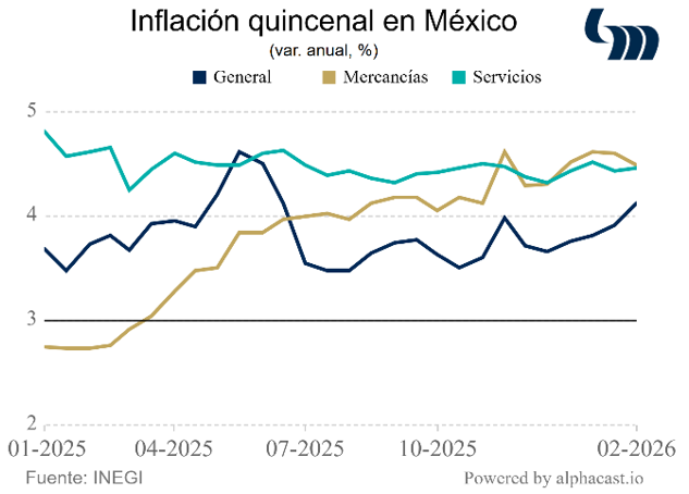 La inflación sorprende al alza y llega a 4.02% anual en febrero (vs E Mifel: 3.94%). La subyacente se mantiene elevada en 4.50% anual. A su interior, las mercancías presentan una aceleración de 4.55% y servicios de 4.45%. La no subyacente, que explica en mayor medida la sorpresa al alza, repunta a 2.44% anual (vs 1.39% anterior). Se debe a que los precios de frutas y verduras aumentaron 9.88% anual—máximo de 16 meses. Empero, los precios de productos pecuarios logran compensar un poco con una variación de 0.98% anual, la más baja en 21 meses. Consideramos que las presiones inflacionarias continuarán y que en próximas lecturas la inflación general se mantendrá por encima del 4.0%. Esta lectura, añadida a la incertidumbre internacional, esta en línea con nuestra previsión de que Banxico no bajará la tasa de referencia el jueves 26.