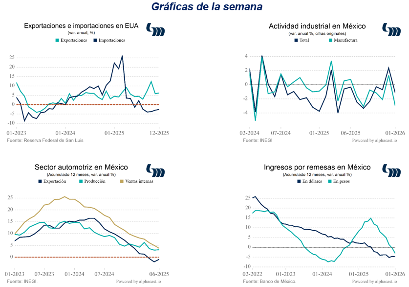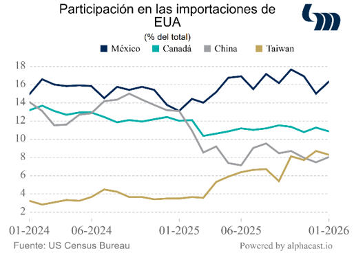 En enero, EUA presenta un déficit de 54.5 mmdd en su balanza comercial. Las exportaciones ascienden a 302.1 mmdd (+10.4% anual) y las importaciones 356.6 mmdd (-11.3% anual). Por porcentaje de participación, México refrenda su posición como el principal proveedor de bienes a EUA, con el 16.3% del total. Le siguen Canadá, Taiwán y China cada uno con el 10.9%, 8.3% y 8.1%, respectivamente. Por otra parte, el gobierno de los EUA anuncia que iniciará investigaciones que pudieran justificar la imposición de aranceles por país bajo la Sección 301 de su código comercial; esto en anticipación del vencimiento obligado del arancel vigente y generalizado que impuso la administración Trump después de que la Suprema Corte declarará inválidos los aranceles aplicados el año pasado. Entre los países que se incluyen en estas investigaciones figura México.