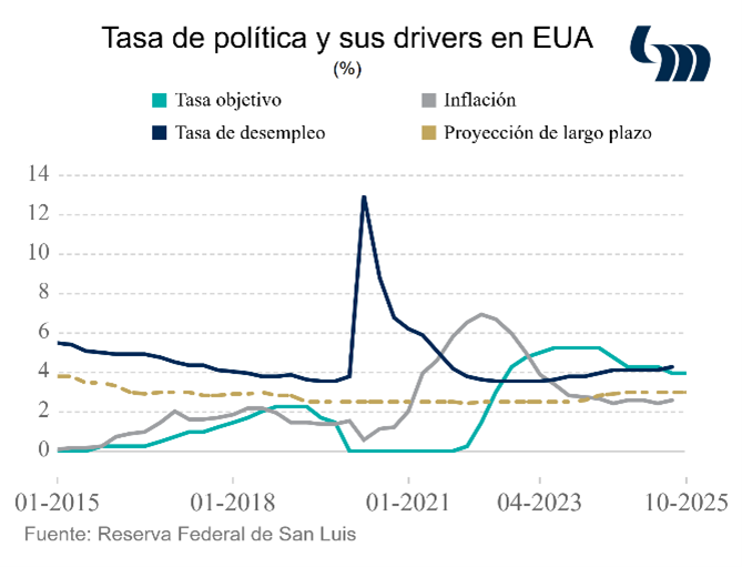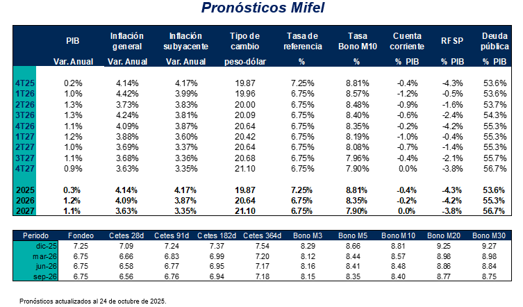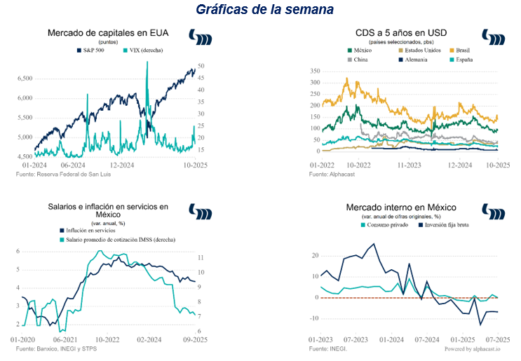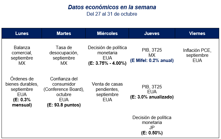 La próxima semana se publica decisión de política monetaria de la Fed. Si bien Jerome Powell no ha señalizado que la normalización de política monetaria proseguiría en la próxima sesión, el mercado de renta fija de EUA descuenta un descenso en la tasa de fondos federales de 25 pb con una probabilidad de 97%. Cabe recordar que las últimas proyecciones de los miembros que votan esta decisión ubican dicha tasa en 3.6%, que implicaría alrededor de dos descensos de 25 pb respecto del rango actual (4.00%-4.25%); únicamente restan dos juntas en 2025. Las decisiones que pueda tomar el banco central americano ocurren en un contexto inusual, pues el cierre de gobierno en ese país implica carencia de muchos datos relevantes para evaluar la marcha de la economía. Al respecto, con retraso se publican datos de inflación de septiembre, la cual se ubica en 3.0% anual, al igual que la inflación subyacente que excluye alimentos y energéticos. Desde los últimos 5 meses, el indicador ha marcado una trayectoria ascendente, con particular persistencia del componente subyacente. Los datos son sin embargo bien tomados por el mercado que reafirma su convicción sobre un recorte la próxima semana.