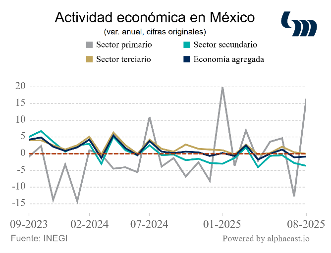La actividad económica cae -0.9% anual en agosto. Esta caída es superior a lo anticipado por el consenso, pero en términos mensuales desestacionalizados la cifra correspondiente es 0.6%, mayor que 0.2% anticipado por el consenso. En el comparativo anual, tanto actividades secundarias como terciarias retroceden, -3.6% y -0.1%, respectivamente. Cabe destacar que dentro de la secundaria todos sus componentes se contraen, en especial construcción y minería (-4.0% y -6.8% anual, respectivamente). Por su parte, las primarias se expanden 16.2% anual. En consecuencia, en lo que va del año, la actividad económica ha caído -0.1% anual.