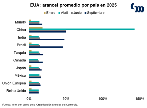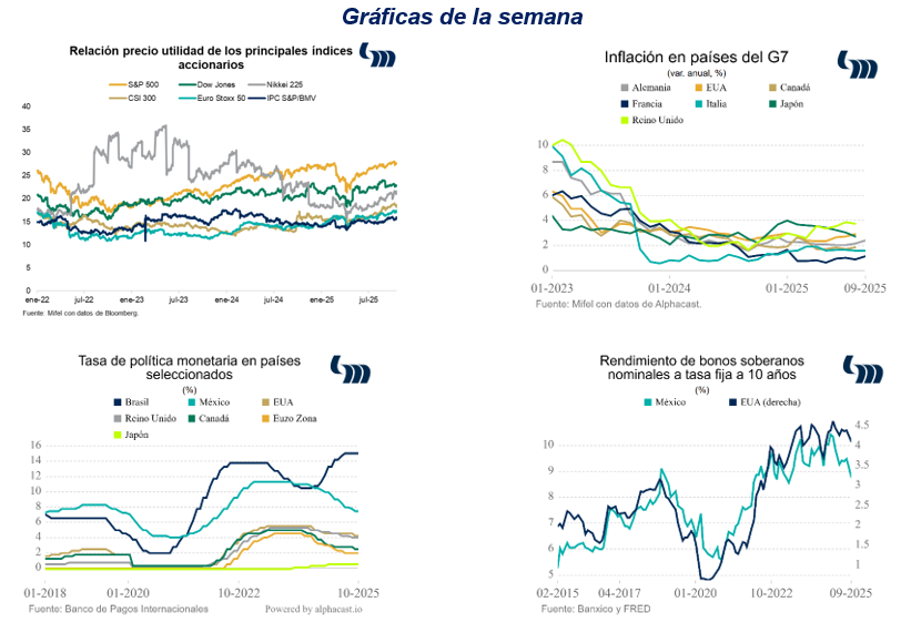 EUA impone aranceles de 100% a China por controles sobre exportaciones, especialmente tierras raras. Dichas tarifas entrarían en vigor el 1 de noviembre. China en respuesta sanciona a empresas surcoreanas vinculadas a EUA; altos funcionarios de ambos países reaccionan; ambos países reculan. El saldo final en los mercados en la semana es IPC S&P/BMV +2.0%, Euro-Stoxx 50 +1.5%, S&P 500 +1.2%, Dow Jones +1.0%, CSI 300 -2.2% y Hang Seng -4.0%. Por su parte, el USDMXN cierra la semana en $18.46 pesos por dólar, lo que representa una fluctuación semanal de -0.7%.