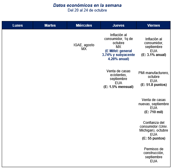 Estimamos la inflación de la primera quincena de octubre en 3.74% anual. La inflación subyacente se ubicaría en 4.28% anual: mercancías 4.16% y servicios 4.40% anual. Por su parte, el componente no subyacente aumentaría 1.92% anual. La incidencia a la baja continuaría con -7.06% anual, mientras que los pecuarios continuarían presionando con 8.65% anual. En paralelo, los precios de energéticos y tarifas de gobierno tendrían una inflación de 1.97% anual, debido principalmente al comienzo de la eliminación de subsidios de tarifas eléctricas por temporada calurosa.