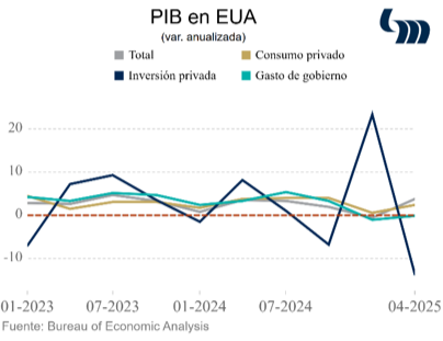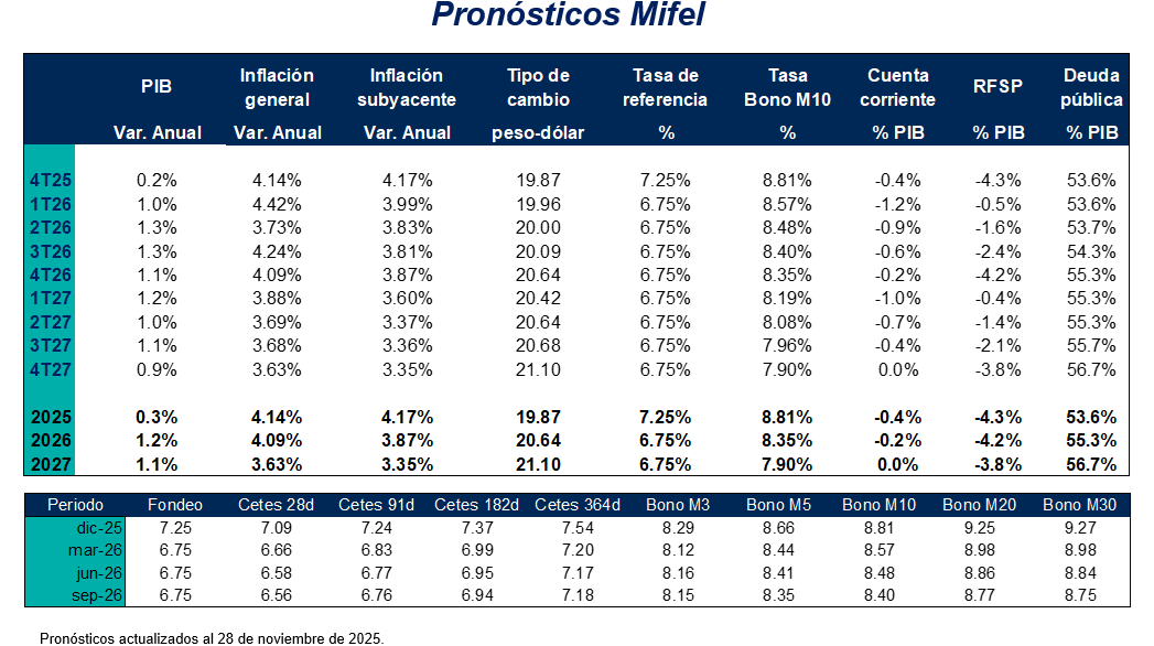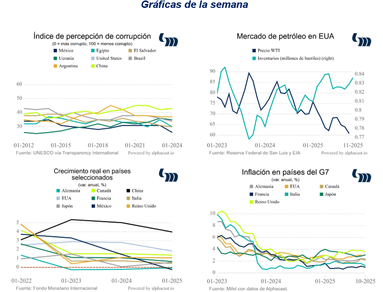 Esta semana se anticipaba la publicación del PIB de 3T25 y la inflación PCE de los EUA de octubre; sin embargo, BLS comenta que no ocurrieron levantamientos de encuestas ni recopilación de datos en la totalidad de los periodos. No obstante, cabe mencionar que el modelo GDPNow de la Fed de Atlanta estima que la economía estadounidense crece 3.9% anualizado en 3T25. El Buró de Análisis Económico no publica resultados oficiales de PIB en 3T25.