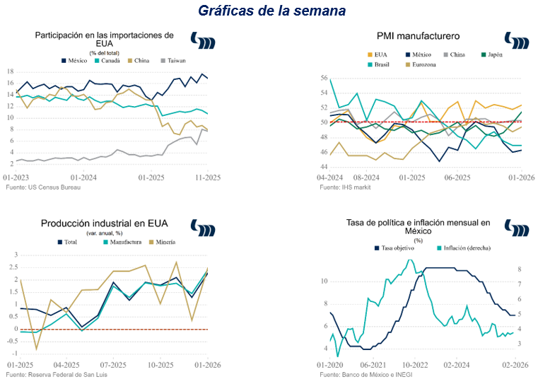 La balanza comercial de EUA cierra el 2025 con un déficit de 901.5 mmdd: las exportaciones ascienden a 3.4 bdd (+6.2% anual) y las importaciones a 4.3 bdd (+4.8% anual). Los principales proveedores de mercancías a EUA en dicho periodo fueron México, Canadá y China, cada uno con 15.7%, 11.2% y 9.2% del total de las importaciones, respectivamente. Las cifras positivas sorprenden en un año de aranceles, pero habrá que ubicarlas en el contexto global (crecimiento notable del comercio intra-regional en Asia, por ejemplo) para darles perspectiva.