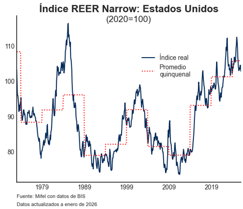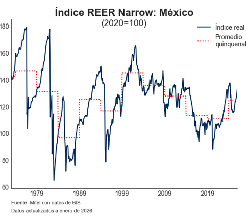 Actualizamos nuestra estimación del tipo de cambio al cierre de 2026 a 19.03 pesos por dólar. Se compara con un pronóstico previo de 20.30 pesos por dólar; este ajuste debe entenderse como resultado de un cambio en nuestra visión fundamental del billete verde - más débil – no como una alteración de nuestra perspectiva de mediano plazo sobre el peso mexicano (sobre eso hablamos en la siguiente sección). A lo largo del 2025 asistimos a una depreciación importante del dólar, de -9.4% anual medida por la canasta de monedas DXY. Hay mucho por discutir sobre las causas de este fenómeno, pero pensamos que está asociado a una reasignación global de portafolios, cuya naturaleza debe ser, necesariamente, privada: del total de activos americanos en manos de foráneos, solo el 13% corresponde a reservas. Bajo esta óptica, pensamos que este ajuste es más permanente y que el dólar permanecerá relativamente “débil". El entrecomillado es necesario porque usando el Tipo de Cambio Real Efectivo (TCRE) del Banco de Pagos Internacionales (BPI), encontramos que, aún en su actual nivel, el dólar es comparativamente más fuerte que en la década pasada, lo que sugiere que no hay una desalineación fundamental.