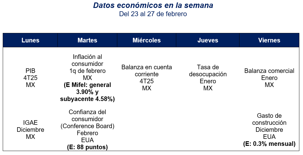 Banco de México publica las minutas de decisión de política monetaria. Pese a que la inflación cerró 2025 dentro del rango objetivo (3.69%), la Junta atribuye el repunte en la primera quincena de enero de 2026 (3.77%) principalmente a factores fiscales y comerciales—cambios en el IEPS y nuevos aranceles—cuyo impacto consideran transitorio, focalizado y sin efectos de segundo orden. Asimismo, la mayoría de sus miembros afirman que, aunque los pronósticos para 2026 se ajustaron al alza por una reducción más lenta en la inflación de servicios, prevén que el descenso inflacionario continúe respaldado por la debilidad de la demanda interna, la apreciación del peso y una postura monetaria restrictiva, manteniendo las expectativas de largo plazo ancladas. En su voto disidente, Jonathan Heath juzga la pausa como correcta pero mal justificada, pues señala un balance de riesgos sesgado al alza y no equilibrado. También critica la omisión del deterioro inflacionario y advierte que cualquier señal de recortes próximos sería prematura e incongruente con la meta del 3%. Insiste en que la guía prospectiva debe supeditarse estrictamente a la evolución de los datos.