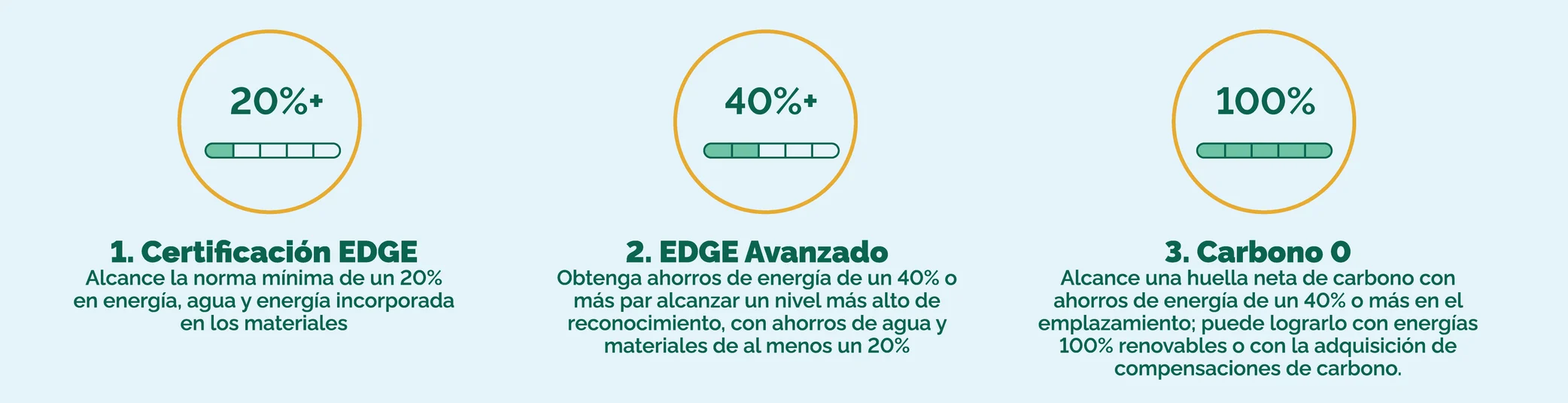 El estado “EDGE Advanced” indica que un proyecto ha logrado un 40 % o más de ahorro de energía por encima de los requisitos mínimos de la certificación EDGE. La certificación EDGE Advanced es un certificado único que no necesita ser renovado. El reconocimiento se emite de forma automática al concederse la certificación EDGE preliminar o la certificación EDGE definitiva, y se indica en el certificado de EDGE para dicho proyecto; no se requiere documentación ni pago de tasas adicionales.